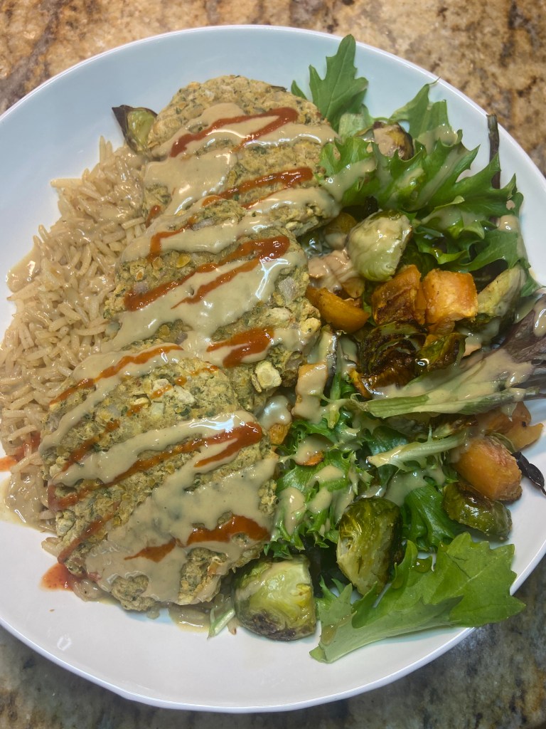 - I love tahini for dipping! Served mine with brown rice & roasted sweet potatoes & Brussels sprouts, tahini & sriracha!