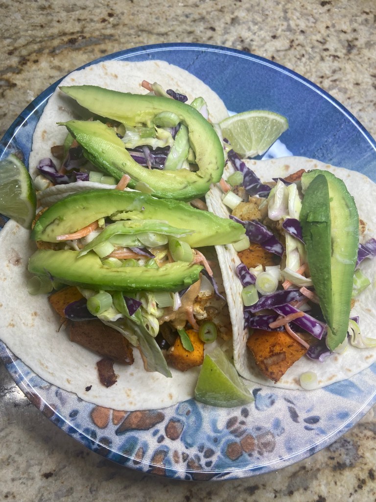 Avocado, black beans, salsa, vegan cheese, vegan sour cream, scallions, lime wedge, or my vegan Cashew Queso recipe: https://veganyogamomma.com/2022/01/11/cashew-queso/
