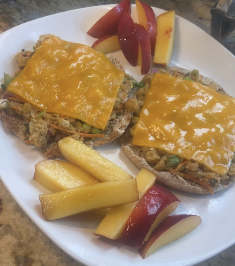 - Prepare the Chickpea-ZZA’s by adding some of the garbanzo mixture to each side of the open-faced pita pocket & add a slice of vegan cheese.