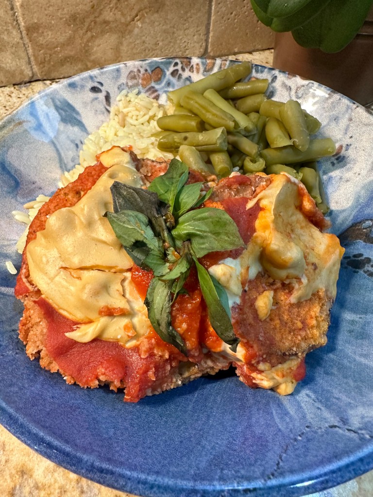 - Set up a dredging station with 2 bowls & a lightly sprayed or parchment paper lined baking sheet pan. In one bowl, whisk together 2/3 cup of plant milk & flour to make a wet batter. In the other bowl, mix the vegan panko/breadcrumbs, nutritional yeast, Italian seasoning & oregano to make a dry coating. Dip each slice of eggplant into the wet batter, then the dry coating & lay them flat on the baking sheet pan until all of them are coated. Bake for 20 minutes & then remove from the oven.