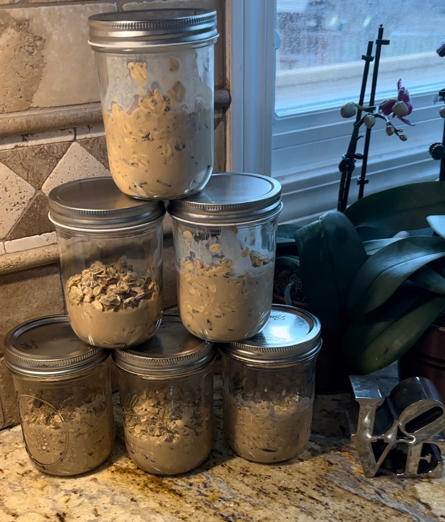 - Pour about 1/2 cup of the mixture into each mason jar, cover with a lid & place them in the refrigerator overnight. Grab one & go in the morning. Option to add chopped peanuts before eating so they don’t get soggy. Stays good for a week refrigerated. Enjoy.