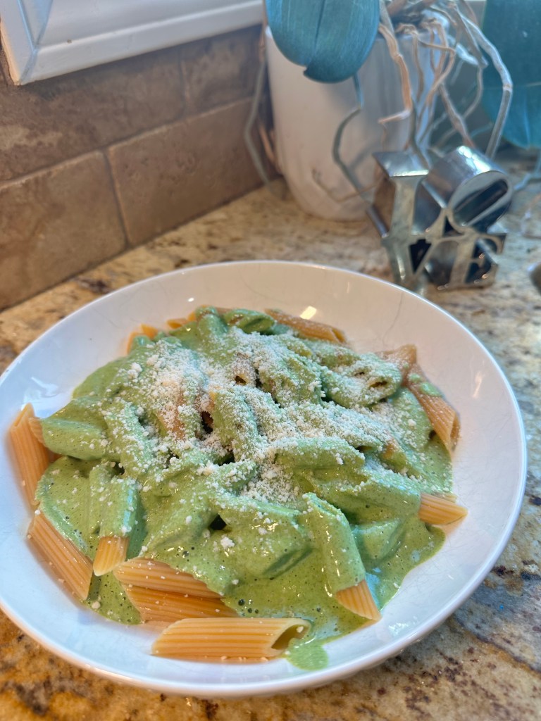 - Add the pasta water & blend well. Serve hot & top with vegan Parmesan cheese. Enjoy!