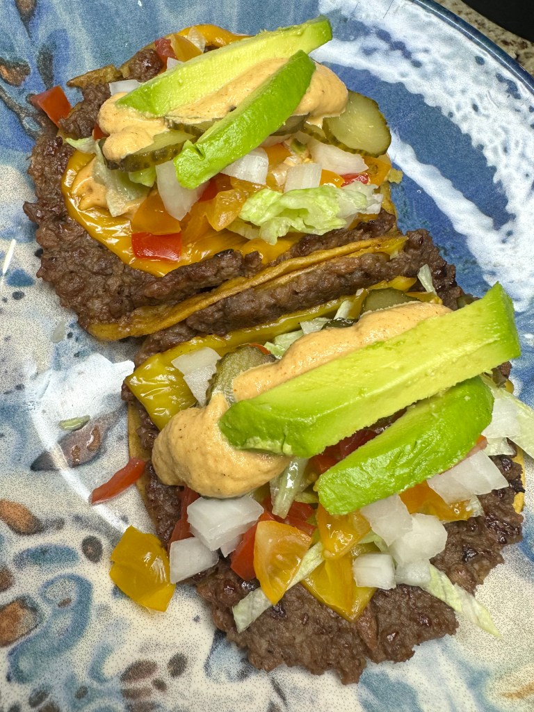 Since they will cook in batches, I like to lay the smashed tacos flat on a tray & heat for about 5-10 minutes in the oven at 350F before adding the special sauce, all of your favorite toppings & enjoying!