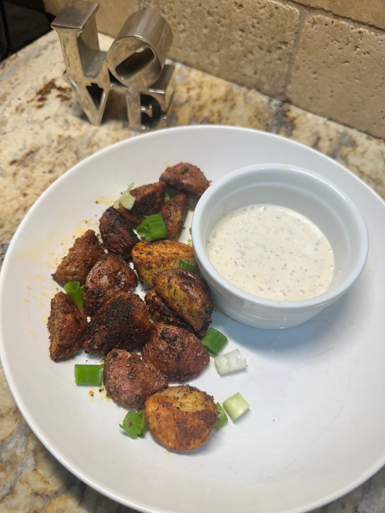 Lay them flat on the olive oil lined tray & bake for 45 minutes. Shake the pan & flip the potatoes half way through cooking. Serve with ketchup or vegan ranch & enjoy!